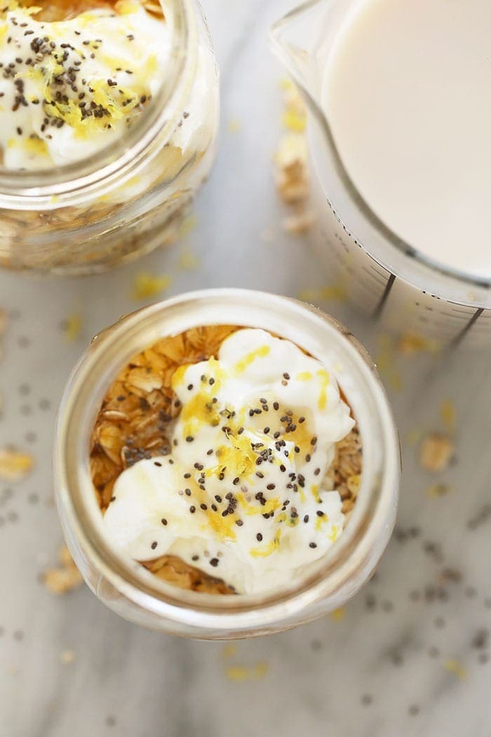 If you love overnight oats, you are going to absolutely adore this recipe! Made with Greek yogurt, chia seeds, and a little bit of lemon zest, this lemon cheesecake overnight oats recipe is one my all-time favorites — it tastes JUST like lemon cheesecake for breakfast!