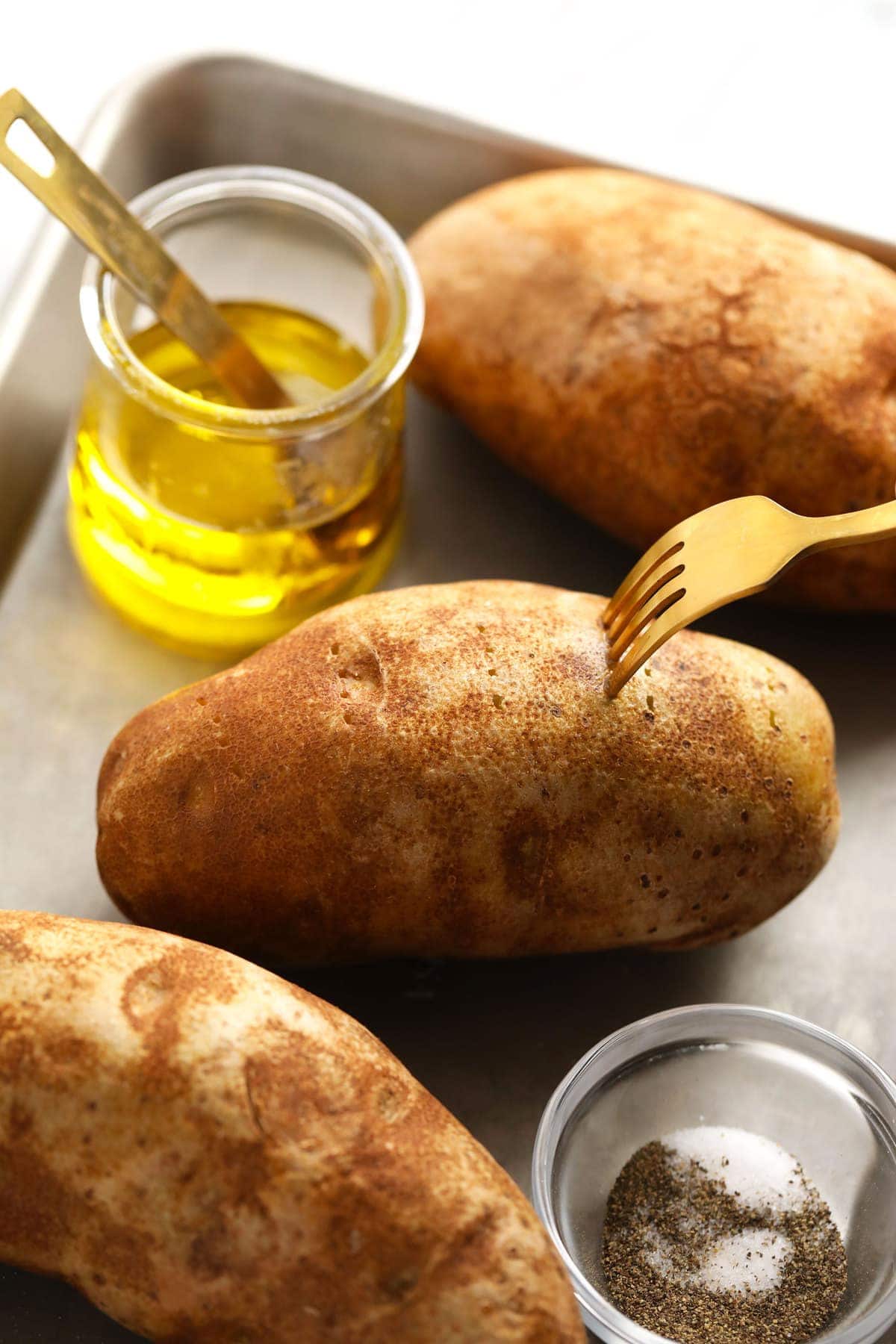 - Wash and dry the potatoes before baking. Use a fork to poke holes all over the potatoes.