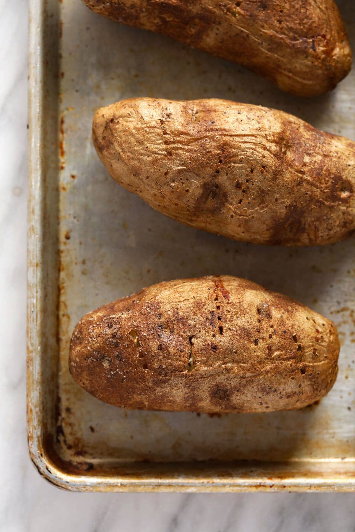 - Bake the potatoes at 425ºF for 45-60 minutes, flipping the potatoes every 20 minutes so they bake evenly.