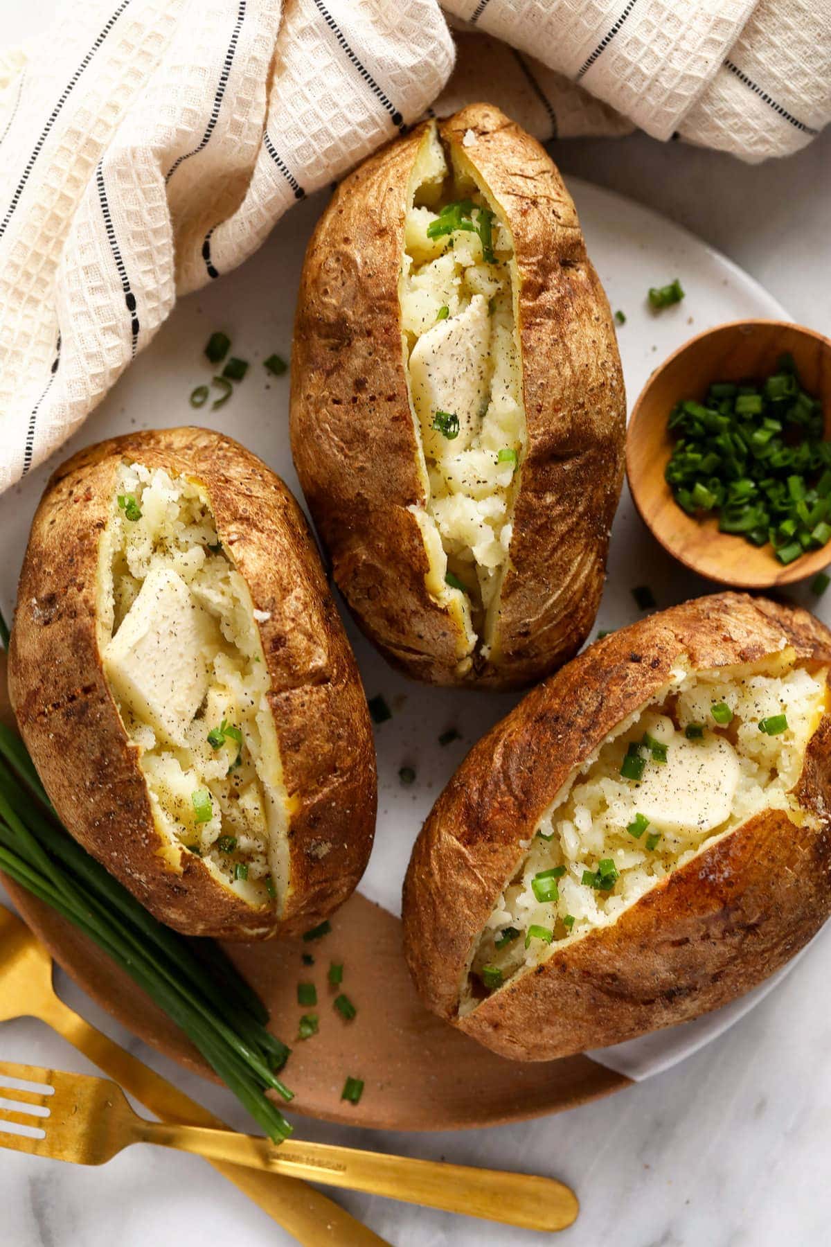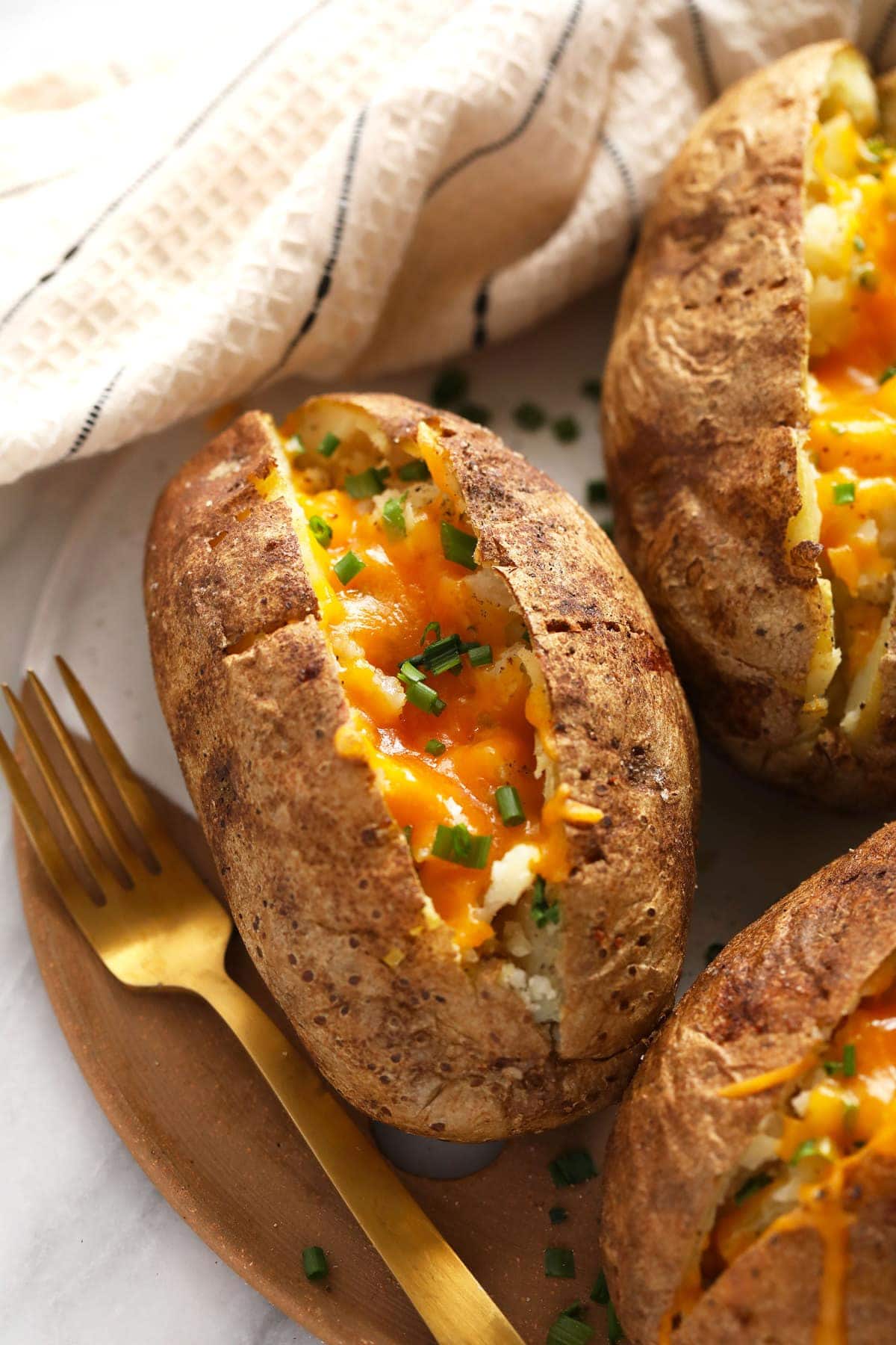 I love a baked potato at home, and so does my family. There is just nothing better than a baked potato with crispy, salty skin, a fluffy inside, and topped with butter and all the best baked potato toppings.